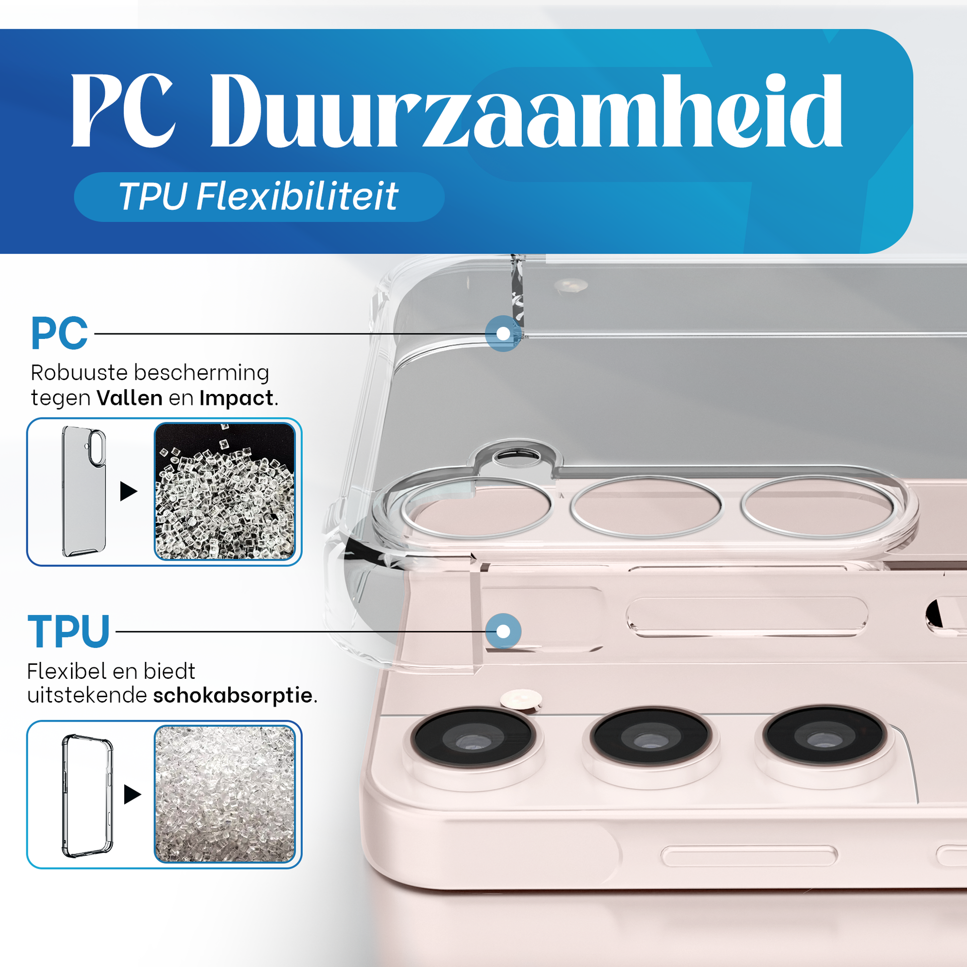 - Materiaal: Duurzaam TPU + PC met versterkte hoeken