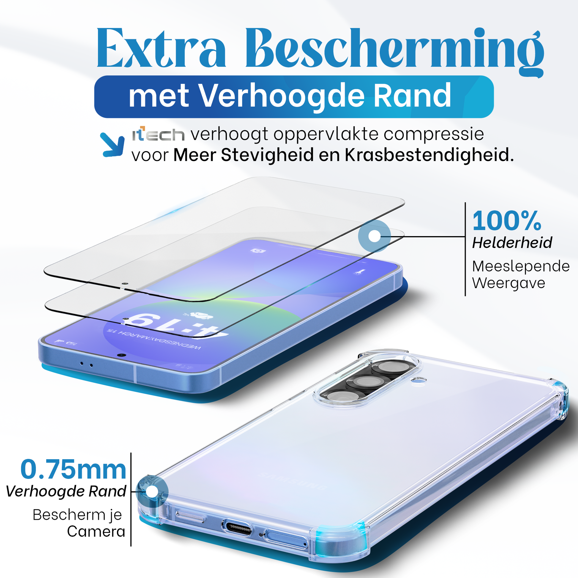 Zorg voor optimale bescherming van je Galaxy A36 met de iTech 3-in-1 Combo – de perfecte combinatie van duurzaamheid, stijl en gebruiksgemak.