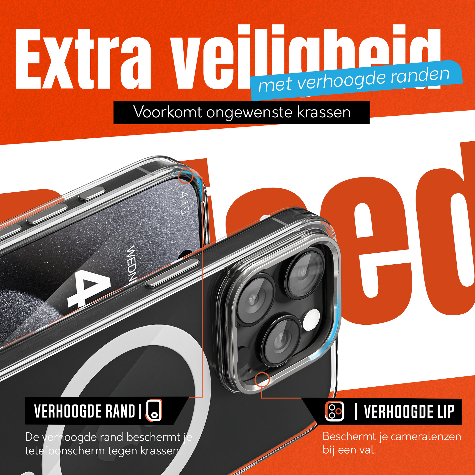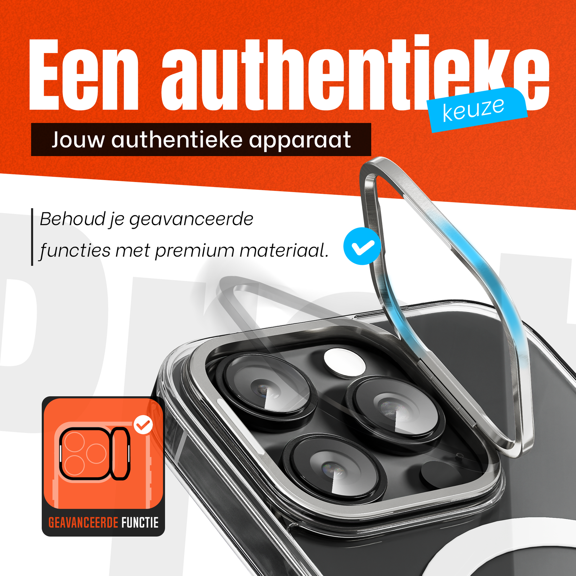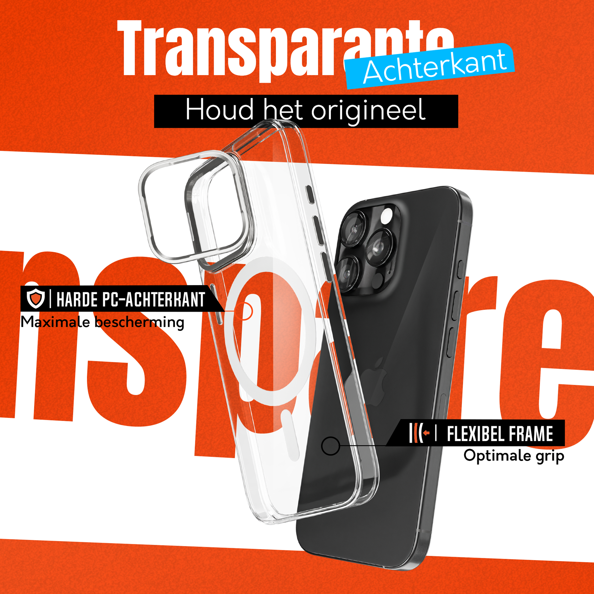 Ervaar een perfecte combinatie van stijl en bescherming met dit hoesje voor de iPhone 15 Pro Max. Het transparante ontwerp accentueert het originele design van je toestel, terwijl de metalen camera-stand en MagSafe-ring functioneel en gebruiksvriendelijk zijn. De witte afwerking in combinatie met de opvallende oranje cameraknop geeft dit hoesje een onderscheidende look.
