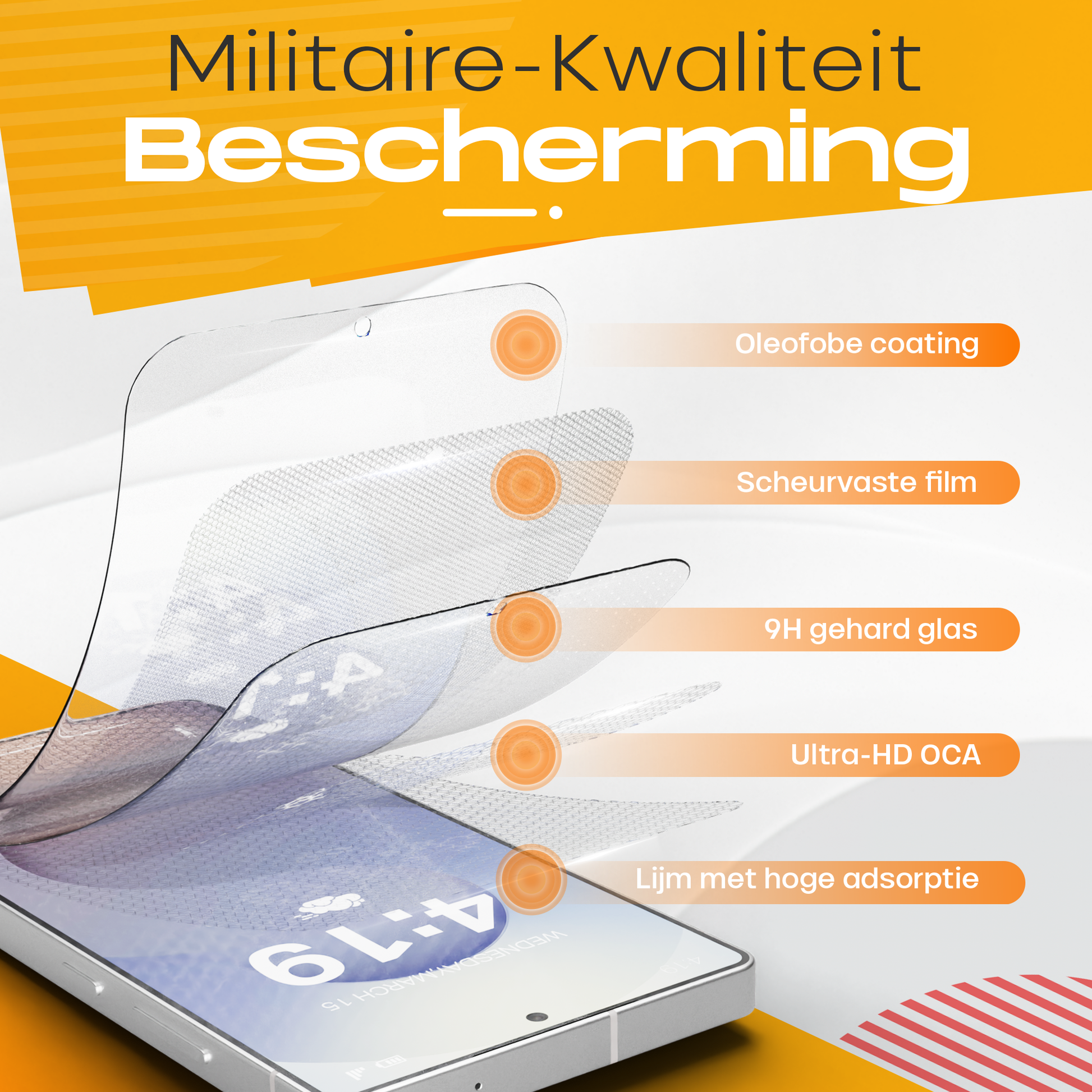 - Rand-tot-Rand Bescherming: Dekking over het hele scherm, compatibel met hoesjes.